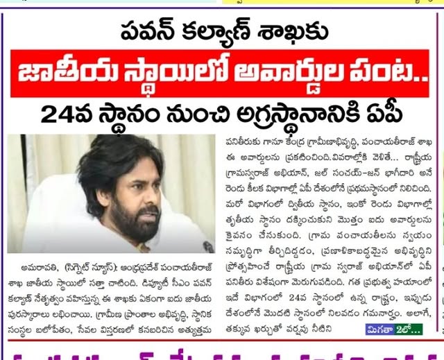 డిప్యూటీ సీఎం పవన్ కల్యాణ్ నేతృత్వంలో ఆంధ్రప్రదేశ్ పంచాయతీరాజ్ శాఖ జాతీయ స్థాయిలో సత్తా చాటింది. గతంలో 24వ స్థానంలో ఉన్న ఈ శాఖ, అగ్రస్థానానికి చేరింది. గ్రామీణ ప్రాంతాల అభివృద్ధి, స్థానిక సంస్థల బలోపేతం, సేవల పనితీరు వంటి విభాగాల్లో ప్రత్యేక కృషికి ఐదు జాతీయ అవార్డులు పొందినట్లు కేంద్ర గ్రామీణాభివృద్ధి, పంచాయతీరాజ్ శాఖ ప్రకటించింది.