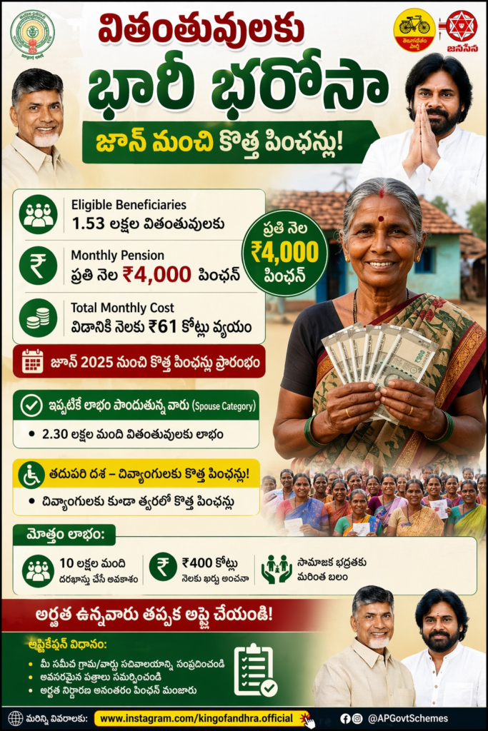 ఆంధ్రప్రదేశ్ రాష్ట్రంలోని వితంతువులకు ప్రభుత్వం పెద్ద శుభవార్త తెలిపింది. రాష్ట్రవ్యాప్తంగా సుమారు 1.53 లక్షల మంది వితంతువులకు ప్రతి నెల ₹4,000 పింఛన్ అందించే దిశగా ప్రభుత్వం కీలక నిర్ణయం తీసుకుంది.