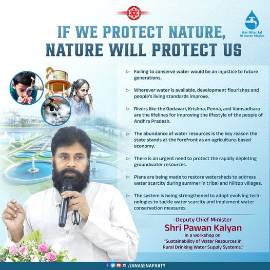 ప్రకృతిని కాపాడితే ప్రకృతి మనల్ని కాపాడుతుంది” అని రాష్ట్ర ఉప ముఖ్యమంత్రి శ్రీ పవన్ కళ్యాణ్ గారు పేర్కొన్నారు. గ్రామీణ తాగునీటి సరఫరా వ్యవస్థలలో ఉపరితల, భూగర్భ జల వనరుల స్థిరత్వంపై నిర్వహించిన వర్క్షాప్లో ఆయన ఈ వ్యాఖ్యలు చేశారు.
