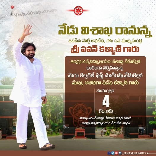 జనసేన పార్టీ అధినేత, ఆంధ్రప్రదేశ్ రాష్ట్ర ఉప ముఖ్యమంత్రి శ్రీ పవన్ కళ్యాణ్ గారు ఈరోజు సాయంత్రం విశాఖపట్నానికి చేరుకోనున్నారు.