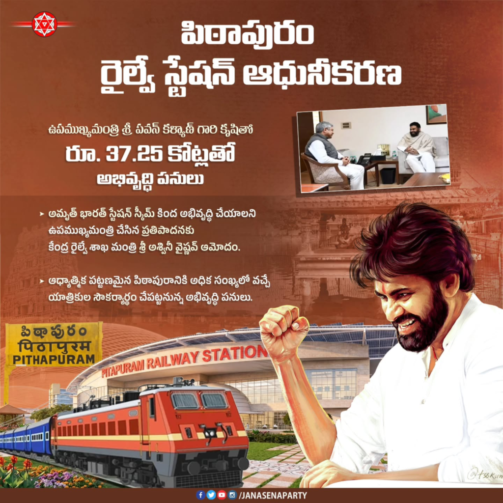• మారనున్న పిఠాపురం రైల్వే స్టేషన్ రూపురేఖలు రాష్ట్ర ఉపముఖ్యమంత్రివర్యులు శ్రీ పవన్ కళ్యాణ్ గారి కృషితో పిఠాపురం రైల్వే స్టేషన్ సకల సౌకర్యాలతో సర్వాంగ సుందరంగా ముస్తాబు కానుంది. పిఠాపురం స్టేషన్ ను అమృత్ భారత్ స్టేషన్ స్కీమ్ కింద అభివృద్ధి చేయాలని ఆయన చేసిన ప్రతిపాదనలకు కేంద్ర రైల్వే మంత్రిత్వశాఖ ఆమోదం తెలిపింది. రూ. 37.25 కోట్లతో స్టేషన్ లో మౌలిక వసతులు అభివృద్ధి చేయనుంది. గత పిఠాపురం పర్యటనలో శ్రీ పవన్ కళ్యాణ్ గారు క్షేత్ర స్థాయి పరిశీలనకు వెళ్లిన సందర్భంలో రైల్వే స్టేషన్ పరిసర ప్రాంతాలు అశుభ్రత, దుర్గంధం వెదజల్లుతుండడాన్ని చూశారు. రైల్వే స్టేషన్ పరిసరాలను తక్షణం శుభ్రం చేయాలని అధికారులను ఆదేశించారు. జనవరి నెలలో జరిగిన ఢిల్లీ పర్యటనలో కేంద్ర రైల్వే శాఖ మంత్రి శ్రీ అశ్వినీ వైష్ణవ్ గారితో సమావేశం సందర్భంగా పిఠాపురం రైల్వే స్టేషన్ అభివృద్ధి కోసం ప్రత్యేకంగా చర్చించారు. ఆధ్యాత్మికంగా ముఖ్య పట్టణమైన పిఠాపురంలోని రైల్వే స్టేషన్ కి దూర ప్రాంతాల నుంచి యాత్రికులు వస్తారని, వారి సౌకర్యార్ధం అమృత్ భారత్ పథకం కింద అభివృద్ధి చేయాలని కోరారు. శ్రీ పవన్ కళ్యాణ్ గారి అభ్యర్ధన పట్ల సానుకూలంగా స్పందించిన కేంద్ర రైల్వే మంత్రిత్వశాఖ పిఠాపురం స్టేషన్ ను అమృత్ భారత్ స్టేషన్ గా అభివృద్ధి చేసేందుకు ముందుకు వచ్చింది. స్టేషన్ భవనం, ముఖద్వారంతోపాటు దివ్యాంగుల కోసం ప్రత్యేక సౌకర్యాలతో కూడిన విశ్రాంతిగది నిర్మాణం, అత్యాధునిక టాయిలెట్లు, డ్రైనేజీ వ్యవస్థ, కేబులింగ్, ప్లాట్ ఫారం అభివృద్ధి, షెల్టర్ల నిర్మాణం తదితర అభివృద్ధి పనులు చేపట్టనుంది. ఈ సందర్భంగా అడిగిన వెంటనే పిఠాపురం రైల్వే స్టేషన్ అభివృద్ధికి నిధులు మంజూరు చేసేందుకు సహాయ సహకారాలు అందించిన గౌరవ ప్రధాన మంత్రి శ్రీ నరేంద్ర మోదీ గారికి, తక్షణం స్పందించిన రైల్వేమంత్రి శ్రీ అశ్విని వైష్ణవ్ గారికి, పిఠాపురం అభివృద్ధికి నిరంతర మద్దతు ఇస్తున్న ముఖ్యమంత్రి శ్రీ నారా చంద్రబాబు నాయుడు గారికి శ్రీ పవన్ కళ్యాణ్ గారు కృతజ్ఞతలు తెలిపారు.