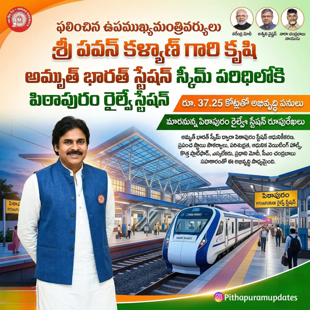 పిఠాపురం: ఆంధ్రప్రదేశ్లో మౌలిక వసతుల అభివృద్ధి దిశగా మరో కీలక ముందడుగు పడింది. ఉపముఖ్యమంత్రి Pawan Kalyan గారి కృషితో పిఠాపురం రైల్వే స్టేషన్ను అమృత్ భారత్ స్టేషన్ స్కీమ్ పరిధిలో అభివృద్ధి చేయాలని కేంద్ర ప్రభుత్వం నిర్ణయించింది.
