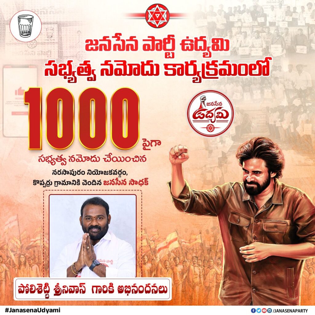 పార్టీ సిద్ధాంతాలను ప్రజల్లోకి తీసుకెళ్లడం, యువతలో రాజకీయ చైతన్యం పెంపొందించడం లక్ష్యంగా ఈ సభ్యత్వ కార్యక్రమం కొనసాగుతోంది. పోలిశెట్టి శ్రీనివాస్ గారి కృషి జనసేన కార్యకర్తలకు ఆదర్శంగా నిలుస్తోంది.