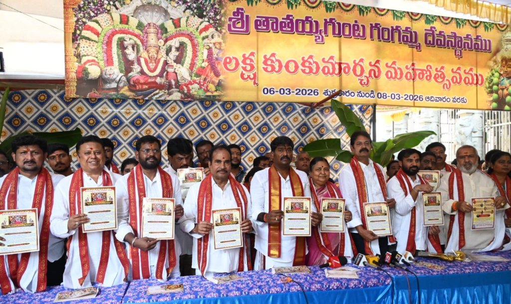 తిరుపతి: మే 5వ నుంచి 13 వరకు తిరుపతి తాతయ్యగుంట గంగ జాతర ఆహ్వాన పత్రిక, క‌ర‌ప‌త్రం, గోడ ప‌త్రిక‌ల‌ను ఆదివారం ఉద‌యం ఎమ్మెల్యే ఆరణి శ్రీనివాసులు ఆవిష్క‌రించారు. మే 5వ తేది రాత్రి చాటింపుతో తాత‌య్య‌గుంట గంగ జాత‌ర ప్రారంభ‌మై మే 13వ తేది తెల్ల‌వారుజామున విశ్వ‌రూప ద‌ర్శ‌నంతో ముగుస్తాయ‌ని ఆయ‌న వెల్ల‌డించారు.